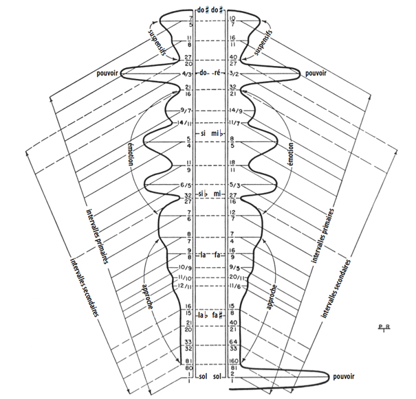 The primary intervals (intervalles primaires) of Partch’s scale use ratios combining the prime numbers up to 11 (2, 3, 5, 7, 11), which makes this in Partch’s theory an “11-limit” scale, as compared to the “5-limit” of Renaissance just intonation (using only 2, 3, and 5). Secondary intervals (intervalles secondaires) include combinations of two primes: for example, 33/32 (33 = 3 x 11) and 21/16 (21 = 3 x 7). The irregular line tracing out the shape of the “one-footed bride” indicates the relative consonance of each interval: the fourth (4/3) and fifth (3/2), for example, are both highly consonant, while complex ratios like 33/32 (a quartertone above the tonic) are dissonant. Intervals are further classified into categories of suspense, power, emotion, and approach (suspensifs, pouvoir, émotion, and approche).